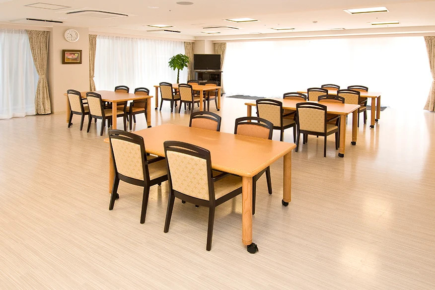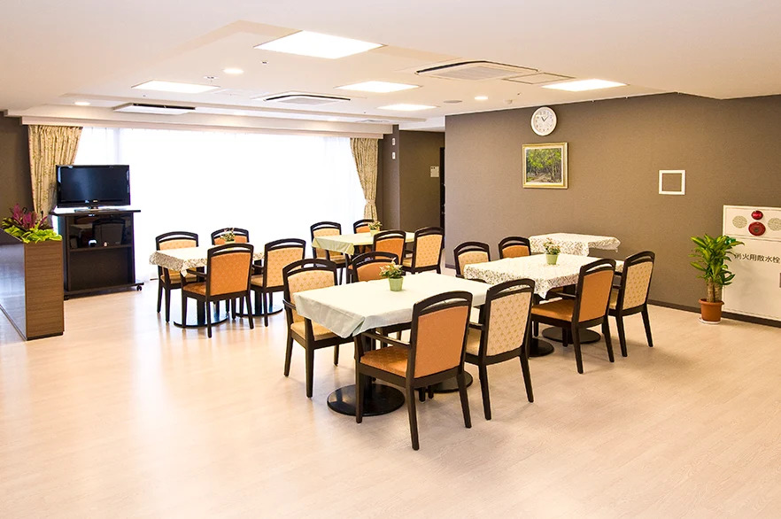 居室数55室の中規模介護付き有料老人ホームです。ストレッチャーを収容できるサイズのエレベーターを備えたバリアフリー設計の建物で、各階に食堂兼機能訓練室と共用浴室が配されていますので、食事や入浴の際にフロアを移動する必要が無く、ゆったりと過ごせます。1階には、理容室や浴室、リラクゼーションルームがあります。リフト浴とストレッチャー浴が出来る機械浴室もございますので、元気な方から介助が必要な方まで、快適な毎日を送ることができます。