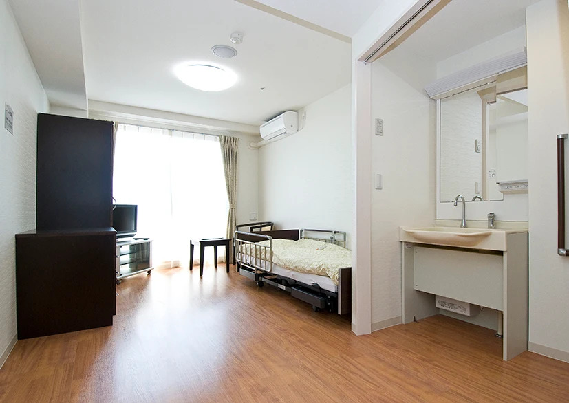 手すりが設置されたフラットフロア各居室には、必要な時にスタッフを呼べるコール装置が配備されています。室内には温水洗浄機能付きトイレも完備されていますので、安心して、ご自分のペースで生活していただけます。