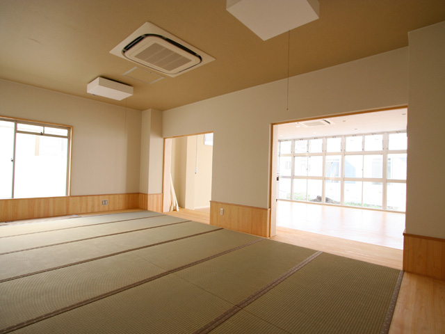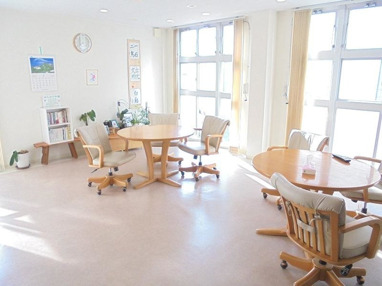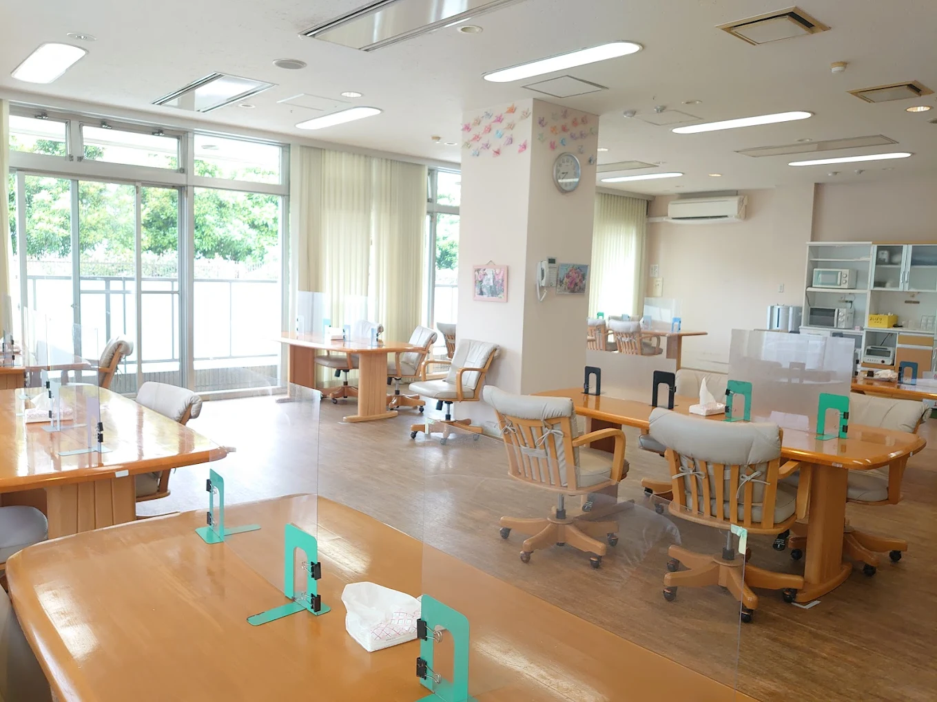 広い敷地に建つ3階建ての介護付き有料老人ホームです。前面道路から玄関までスロープが設置されていますので、車いすをご利用の方でもストレスなく出入りすることが出来ます。1階には、天井高の大きな窓から自然光が差し込む広い食堂、お庭を眺められる談話室、足を延ばして寛げる和室があり、お好みの場所で食事やおしゃべりを楽しめます。共用の浴室は各フロアにございます。1階はストレッチャーリフト付大浴場、2・3階はリフト付個浴ですので、お身体の状態に合った浴室で入浴をお楽しみいただけます。