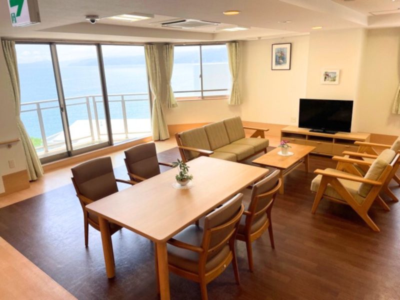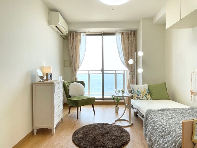 海を一望できる高台に位置する、開放感あふれる4階建てのサービス付き高齢者向け住宅です。60室ある居室は全室オーシャンビューで、リゾートホテルに滞在しているような気分でお過ごしいただけます。室内に洗面台とトイレを完備しており、トイレ内とベッドサイドにナースコールが配備されていますので、安心して一人時間を満喫できます。
