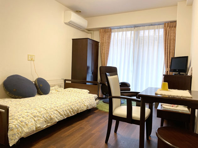 76室ある居室はプライバシーが保たれる完全個室で、ご夫婦やご家族で入居いただける2人部屋もございます。電動式介護ベッドや車いす対応洗面化粧台・トイレが完備されており、クローゼットやテレビも備え付けなので快適にお過ごしいただけます。