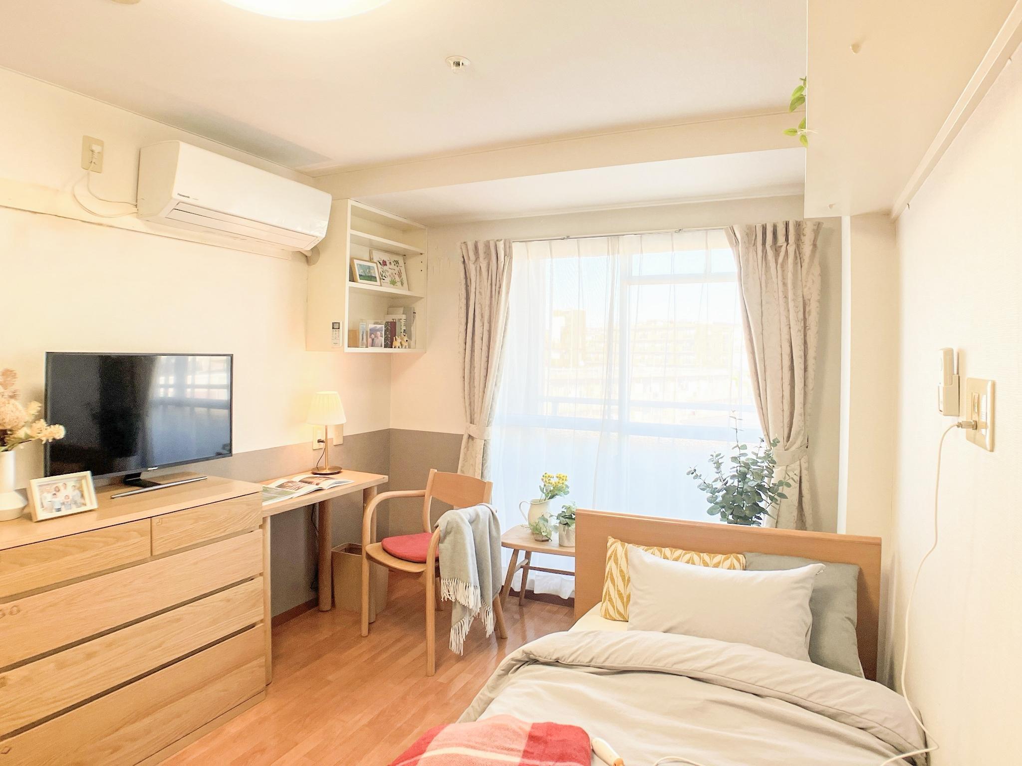 21室ある居室はプライバシーが守られる完全個室で、エアコンとクローゼットが備え付けられています。緊急コールを設置してありますので、安心してプライベートタイムをお楽しみいただけます。