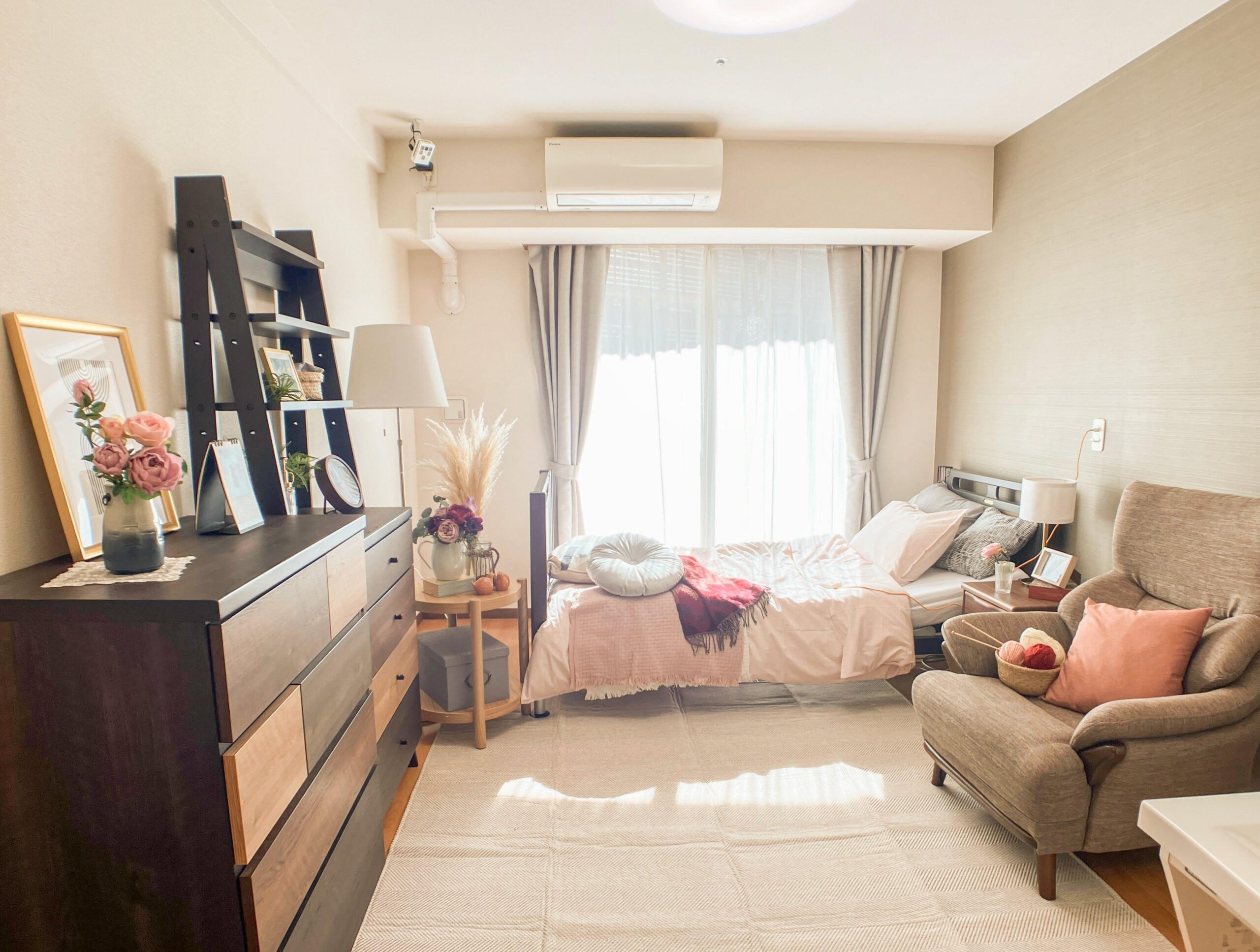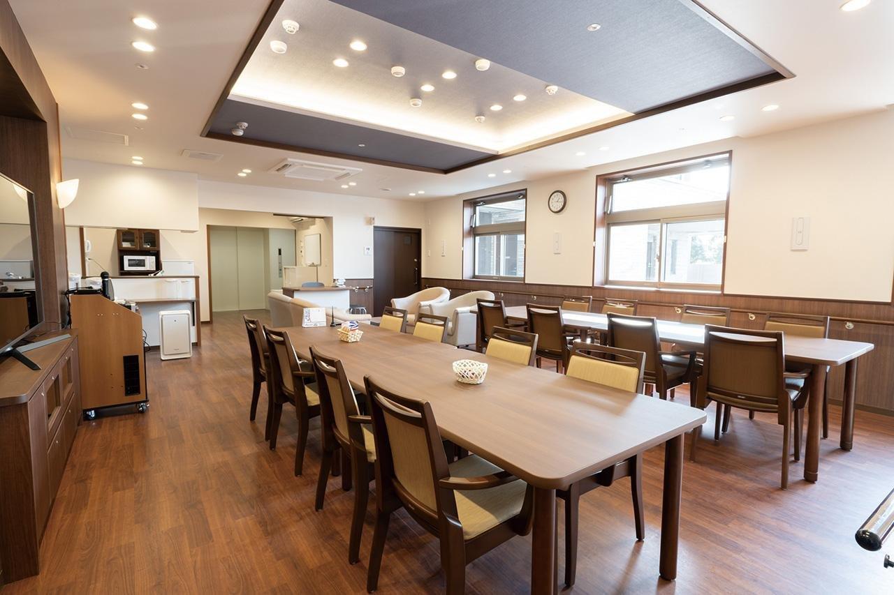シックなカラートーンの外観で、バス通りに面した3階建ての施設です。62あるお部屋はすべてプライバシーに配慮された完全個室となっており、電動式介護ベッドやエアコン、温水洗浄便座付きトイレなどを完備した居室には、お好みでソファーやいすなども設置可能でゆったりと自由にお過ごしいただけます。