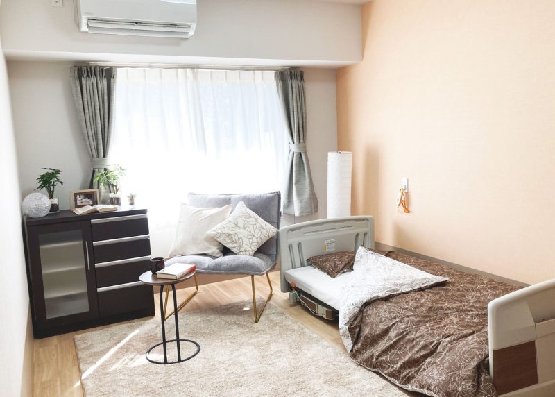 エアコン完備の各居室内には、トイレと洗面台が備わっています。ベッド脇とトイレ内にナースコールが配備されていますので、安心して一人時間をお過ごしいただけます。