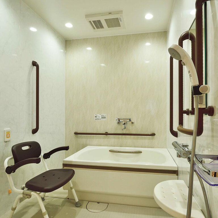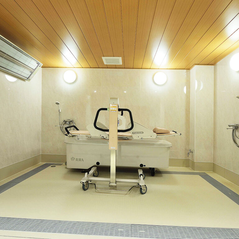 食事やレクリエーションの際に使用する食堂は、3方に窓がある明るい空間です。共用浴室は、機械浴槽を備えた浴室1室と一般浴室3室で、介護度が高くなっても安全に入浴をお楽しみいただけます。