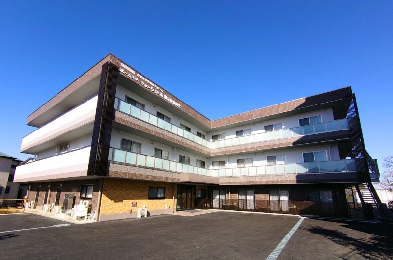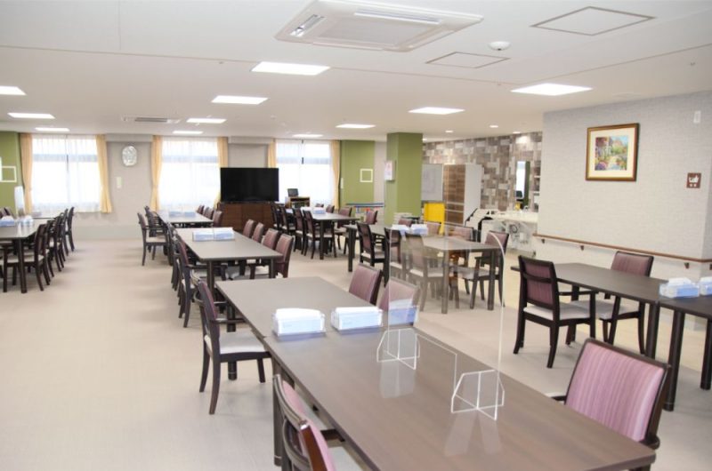 広い敷地に建つ3階建ての介護付き有料老人ホームです。前面道路から建物まで距離があるため、車や人の往来など、喧騒から離れた静かな住環境です。段差のない自動ドアの玄関から入る館内は、どなたにとっても生活し易いバリアフリー設計で、ストレッチャーを格納できるエレベーターも完備しています。共用部には広々とした食堂のほか、ソファセットが置かれたリビングスペース、IH式コンロ付きのキッチン、機能訓練コーナーなどがあり、思い思いに寛ぎの時間をお過ごしいただけます。