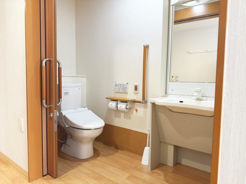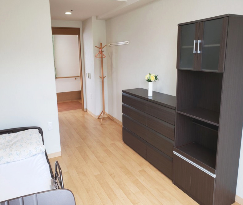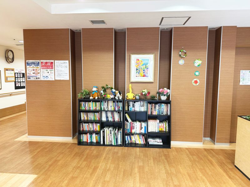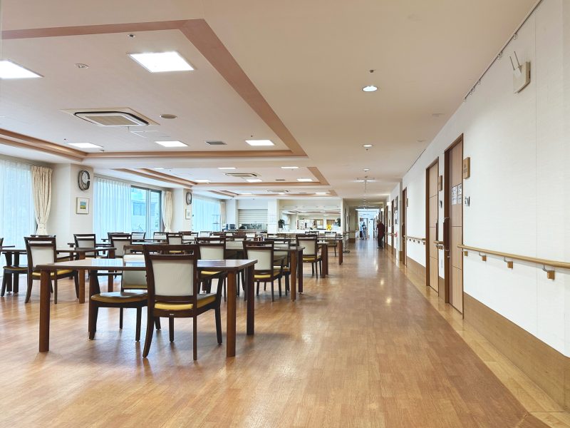 居室数は全59室、すべてがプライバシーに配慮された完全個室です。居室内にはナースコールのほか、洗面台、トイレ、収納などの設備が完備されています。居室面積は18㎡あり生活しやすい広さが確保されています。共用部には食堂、談話スペース、機能訓練室、健康管理室などがあり、エントランスには本棚がありますので、読書もお楽しみいただけます。食堂や談話スペースではご入居者様どうしで会話に花を咲かせるなど、交流を深める場としても活用いただいています。