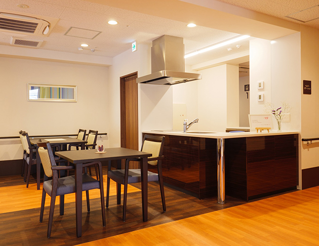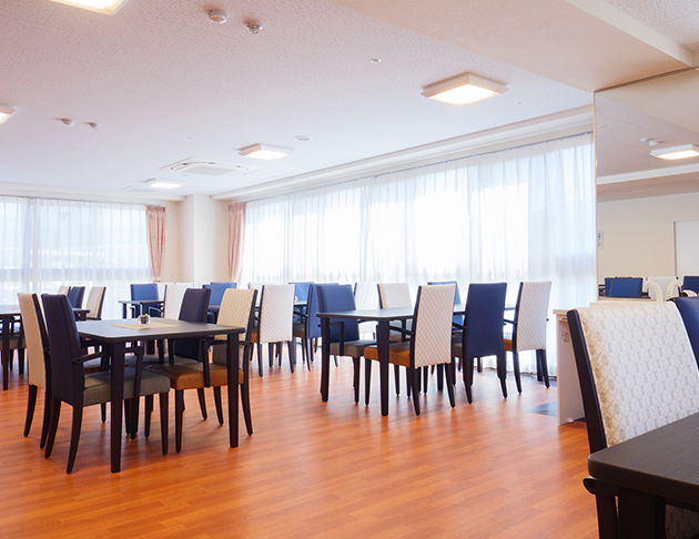 こちらの施設の特徴の一つは、壁2面にわたる広い窓が魅力の明るい食堂です。4階にあり、ご入居者様が朝昼夕食と気持ちよく召し上がることのできる環境が整っています。もちろん、お食事にもこだわり、美味しさ、栄養バランスの考えられた嚥下が不安な方であってもいつまでもお食事の時間を楽しみにしていただけるよう、ご入居者様の状態に合わせた食事形態にも対応しています。