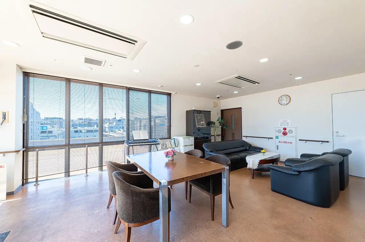 駅や商業施設が徒歩圏に揃う、7階建ての都市型高層施設です。共有スペースは6階部分に集約されており、眺望を楽しみながら開放的な空間でお過ごしいただけます。機能訓練スペースを兼ねたダイニングルームと広々とした共同浴室、介護度の高い方でも入浴していただける機械浴槽を備えた特別浴室が完備され、7階部分の周辺の街並みを一望できるテラスガーデンとサンルームでは、お天気の良い日にはひなたぼっこを楽しめます。