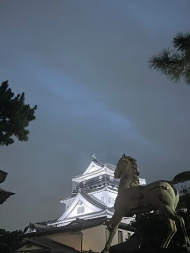 夜に降り立ったので堀やお城の中などを見る事は出来ませんでしたが、お城の壁がライトで照らされ白が映える綺麗なお城でした🏯