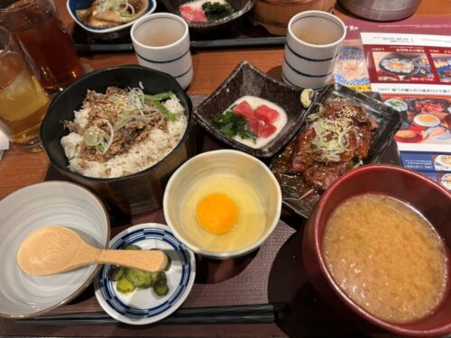 鯛めしだけでも十分過ぎますが、生卵にマグロとろろ、ステーキと