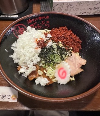 1つ目は、「油そば ぶらぶら 地獄の油そば」です! 辛さレベル★★★★☆
