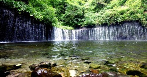 名前の通り岩肌から地下水が絹糸のように優雅に流れ落ちる滝で、自然の清涼感と水音に日頃の疲れがすっと消えていくような気がします笑