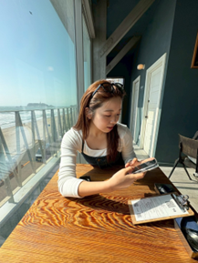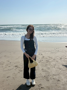 そのあと向かった江ノ島は、私自身も初めてでワクワクが止まりませんでした。島に渡ると一気に海が広がって、潮風の匂いが心地よく、日常の疲れが軽くなりました。海沿いにはサーフィンを楽しむ人たちがたくさんいて、波に乗る姿を見るだけで気分が上がりました。サーフィンが好きな私にとっては、ただ眺めているだけでも最高の時間でした。