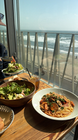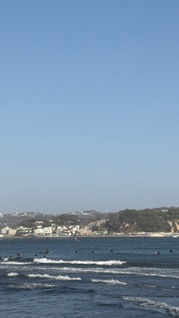 そのあと向かった江ノ島は、私自身も初めてでワクワクが止まりませんでした。島に渡ると一気に海が広がって、潮風の匂いが心地よく、日常の疲れが軽くなりました。海沿いにはサーフィンを楽しむ人たちがたくさんいて、波に乗る姿を見るだけで気分が上がりました。サーフィンが好きな私にとっては、ただ眺めているだけでも最高の時間でした。
