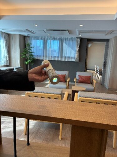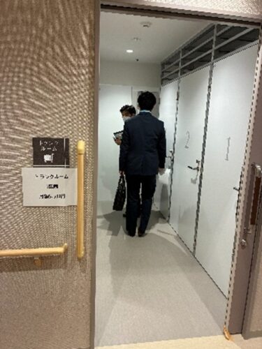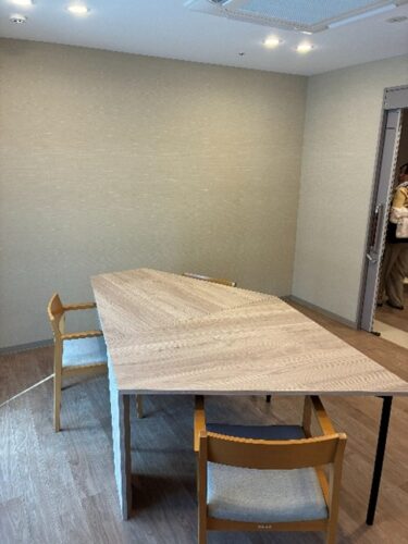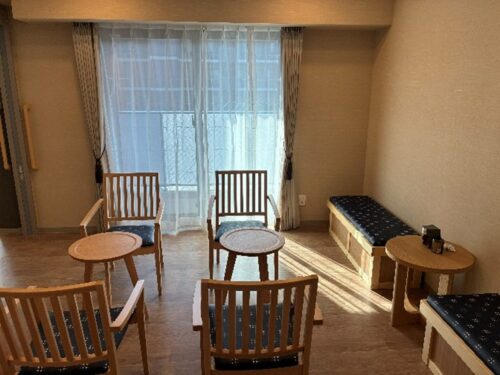 なぜこのような形にしたのかを老人ホームの方にお聞きしたところ、入口からパッとお部屋が丸見えになることが嫌なご入居者さんもいらっしゃるみたいです。そのため仕切りのようにあまり中の様子を見えない仕組みに配慮されていました。